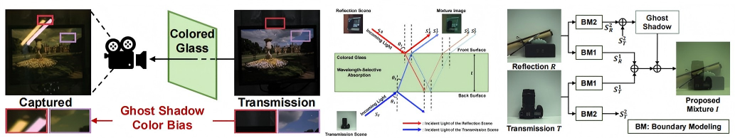 经过彩色玻璃捕获的照片存在严重的色偏和鬼影,研究团队针对这一现象,考虑玻璃的选择性吸收,提出被忽略的彩色玻璃降解问题。基于偏振成像理论,首次对全流程偏振光的传输进行建模,建立偏振状态追踪模型(PSTM),并提出了一种基于物理的窗口环形通道注意力机制。