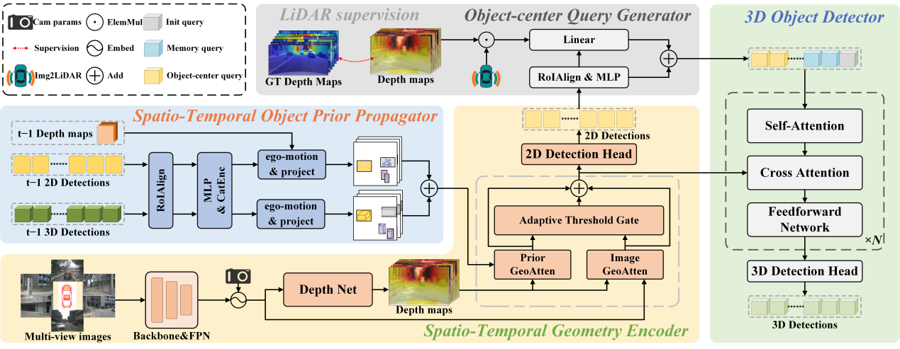 研究团队针对现有环视3D检测器过度依赖当前帧2D信息而导致的时空表征不一致及遮挡下目标易丢失等问题,提出了时空统一表征学习框架STUR3D。该框架创新性地引入了时空物体先验传播模块,顺利获得显式融合历史检测结果、注入深度感知的几何先验,推进2D与3D感知间的时空对齐,显著增强了系统在动态及遮挡场景下的检测稳定性与定位精度。在nuScenes测试集上达到57.9%mAP和64.6% NDS的顶尖性能,有效解决了现有2D-to-3D流水线中的性能瓶颈。