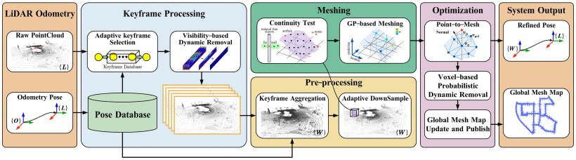 科研团队创新设计了两阶段由粗到精的动态点移除方法,该方法为首个显式实现动态移除的网格构建方法。他们提出了自适应关键帧选择与下采样策略,保证了点云分布均匀性,为高斯过程建图给予高质量训练数据。此外,采用了高斯过程增量式网格构建与点到网格配准优化方法,顺利获得陆续在性检测剔除离群点。