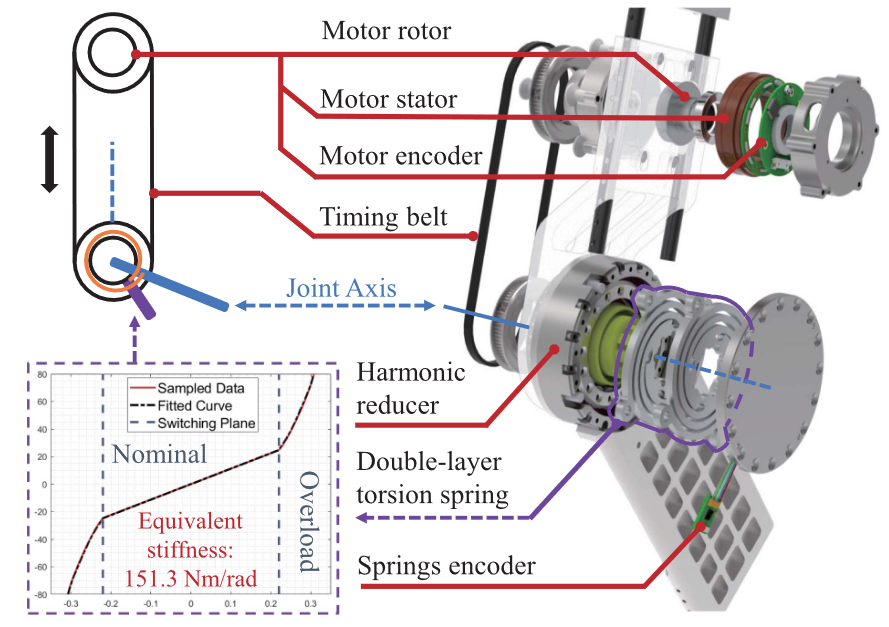 为此,科研团队设计了一种匹配人体关节自适应运动特性的刚柔耦合驱动关节,并构建了矢状面内髋-膝-踝关节柔顺驱动康复外骨骼系统。该系统是基于一种多模态刚度特性的弹性元件,从而实现人体关节短程刚度特性的仿生映射,在技术上取得了康复外骨骼关键零部件的突破。团队进一步构建了柔顺交互的驱动-关节-构型多维度人机适配的轻量化系统性方案,从而实现柔顺交互的驱动-关节-构型多维度人机适配。
