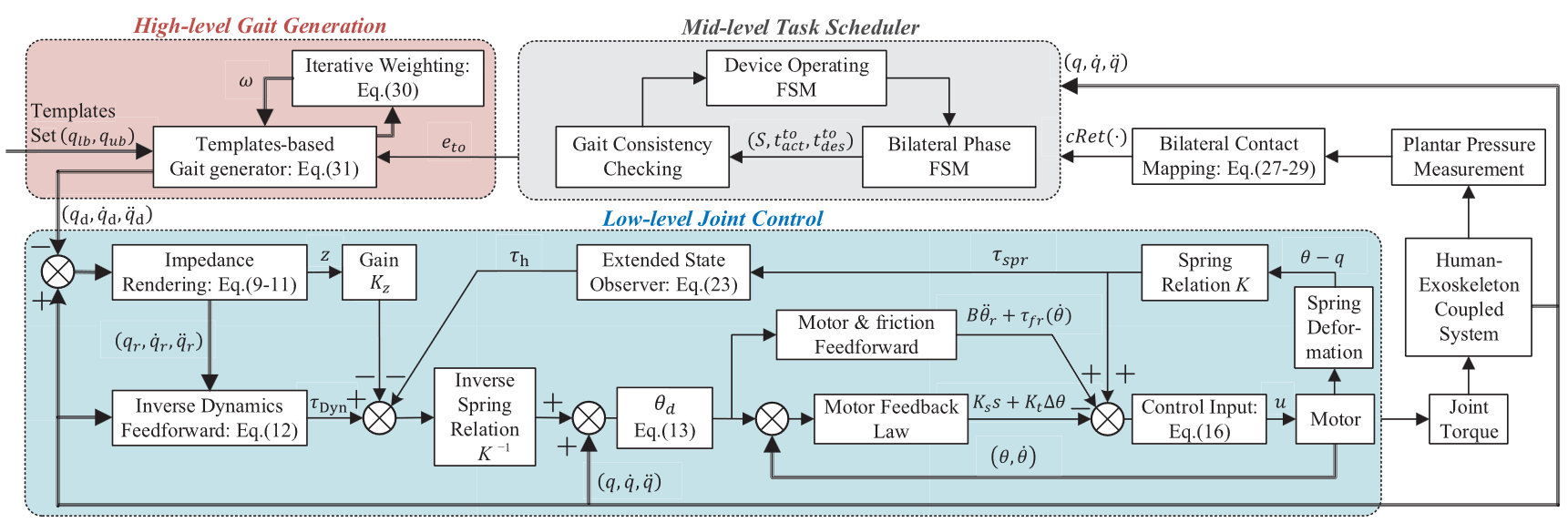 针对偏瘫患者双侧差异化运动机能与康复需求,团队提出了一种“规划-协同-控制”的多层次融合交互控制框架,突破了传统控制方法在“完全引导”与“完全顺应”之间的局限。顺利获得结合多模板步态与实时状态反馈,该方法实现了耦合辅助下的生物力学特性重建与自适应规划,并在关节级控制方面引入了阻抗渲染控制方法,实现刚柔耦合双系统闭环稳定下的宽阻抗范围交互控制。